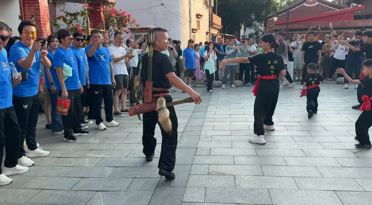 表演在古鎮古厝石埕進行,小拳師們身著傳統練功服精神抖擻,展現出五祖鶴陽拳的剛柔并濟之美。